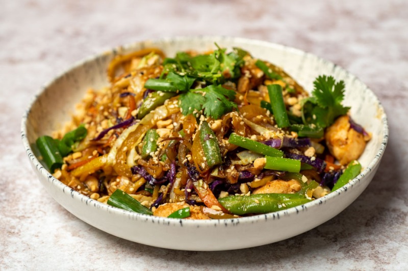 נתחי עוף, מבחר ירקות שוק מוקפצים עם רוטב אסיאתי, בעיטור בוטנים ושומשום קלוי.