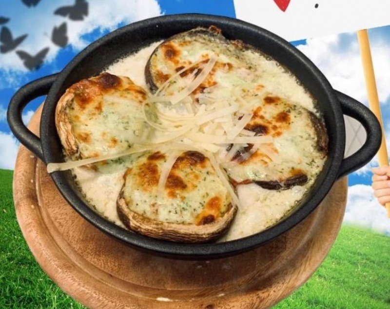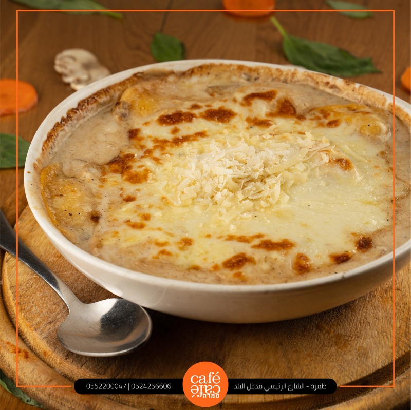 קוביות צ'יפס, פטריות עם רוטב שמנת פטריות, אפייה בתנור. ניתן להוסיף הקרמה עם גבינת מוצרלה (בתוספת: ₪ ), ניתן להוסיף נתיחי עוף: 12 ₪ )