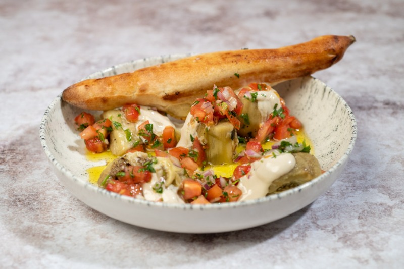 חציל קלוי , טחינה , סלסת עגבניות , עשבי תיבול ופלוט לניגוב .