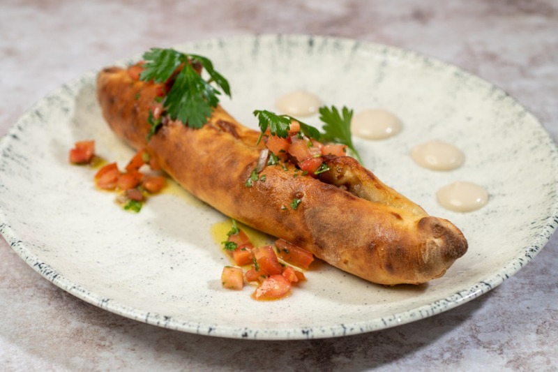הבצק שלנו במילוי תבשיל אסאדו מפורק , עם סלסה עגבניות , איולי שום נענע וטחינה לבנה