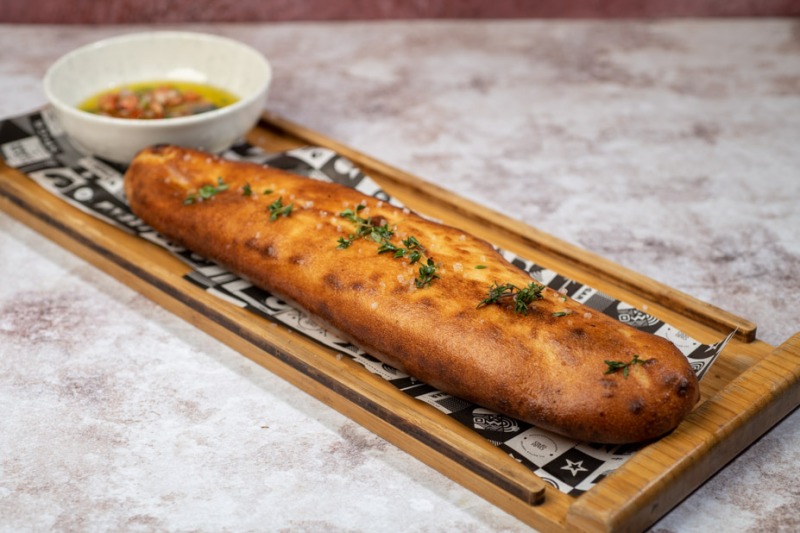 נאפית במקום בתנור אבן , מוגשת בליווי שמן זית , בלסמי , שום קונפי וסלסת עגבניות