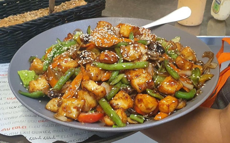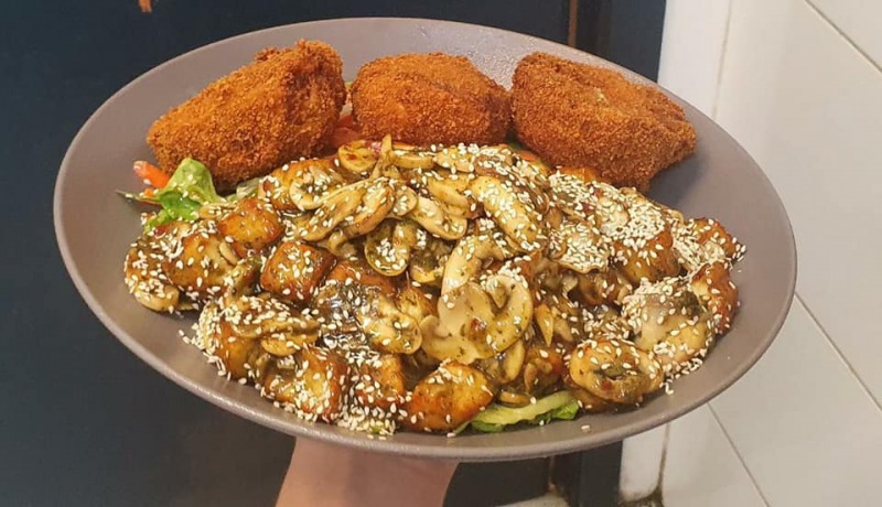 פטריות פריכות ממולאות בגבינות, קוביות חלומי צרובות ומוקפצות עם רבעי פטריות, ואגוזי מלך ברוטב טריאקי ופסטו, מונחים על תערובת עלים, עגבניות שרי, מלפפון, רצועות גזר, בצל סגול וירוק, בתיבול הויניגרט שלנו.