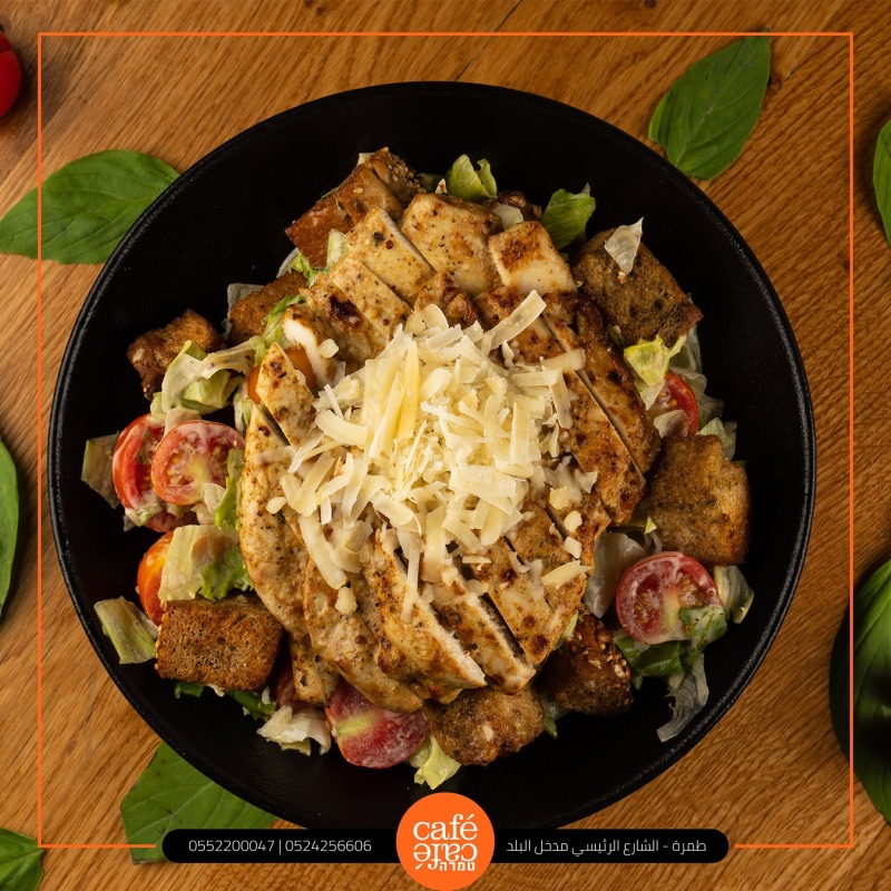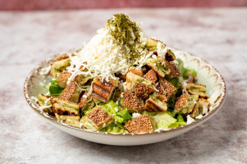 קוביות טוסט מבייגל שומשום עם תערובת גבינות ופסטו מוקפצות בחמאת שום, מונחות על תערובת עלים, עגבניות שרי, מלפוון, רצועות גזר, בצל סגול, זיתי קלמטה, וגבינה בולגרית מעל, בתיבול הויניגרט שלנו.
