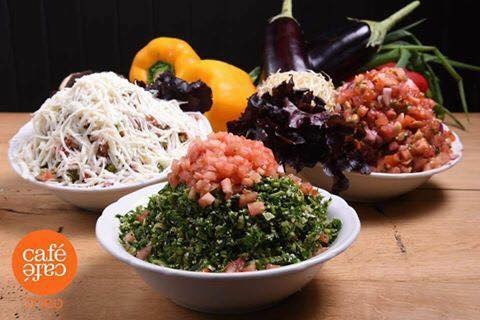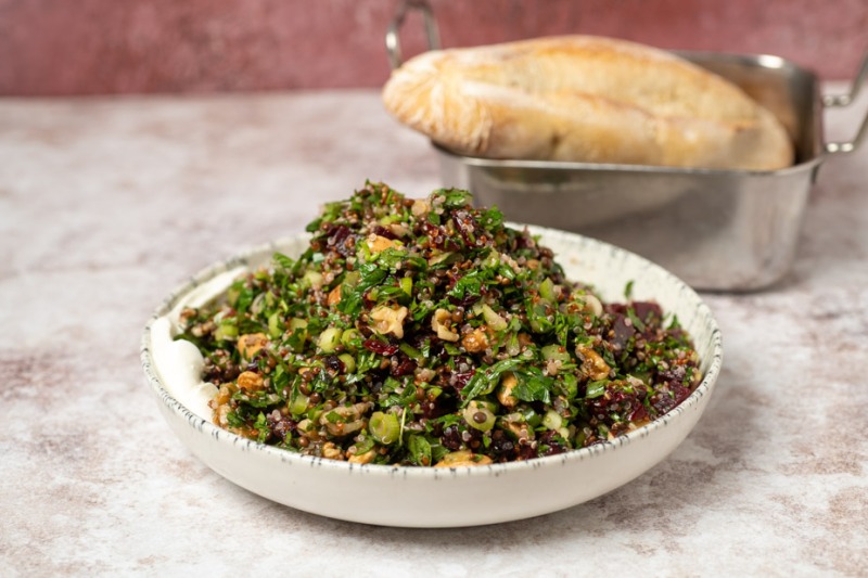עדשים שחורות , קינואה , קוביות סלק , עלי סלרי , המון פטרוזיליה , בצל ירוק ונענע קצוצים דק , חמוציות , שקדים קלויים , בתיבול שמן זית לימון ובתוספת גבינת לאבנה / טחינה
