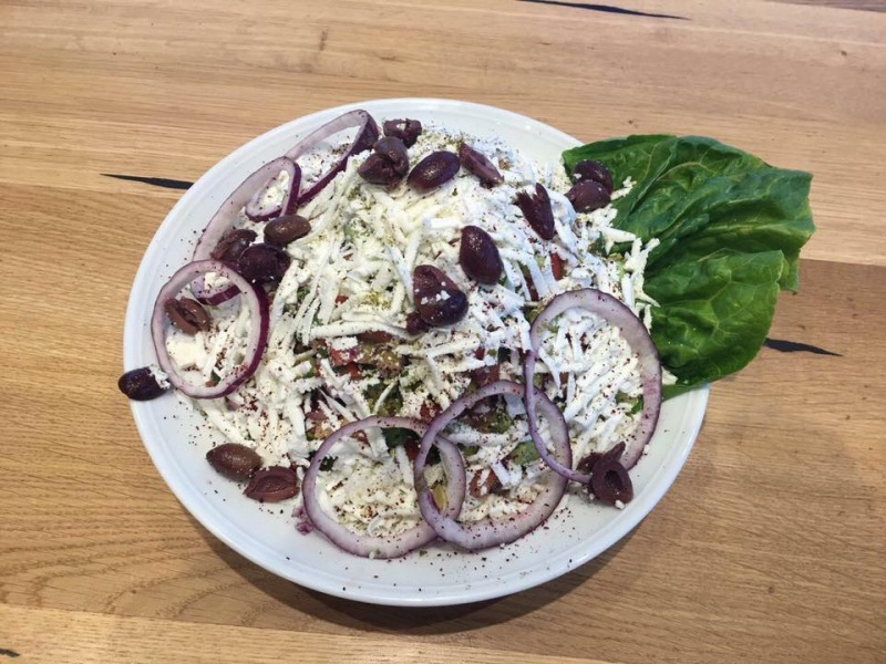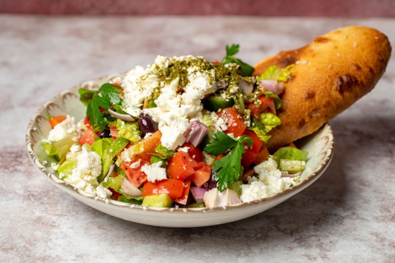 מלפפון, עגבניות, בצל סגול, זיתי קלמטה, פלפל אדום בתחמיץ לימון ושמן זית, גבינה בולגרית.